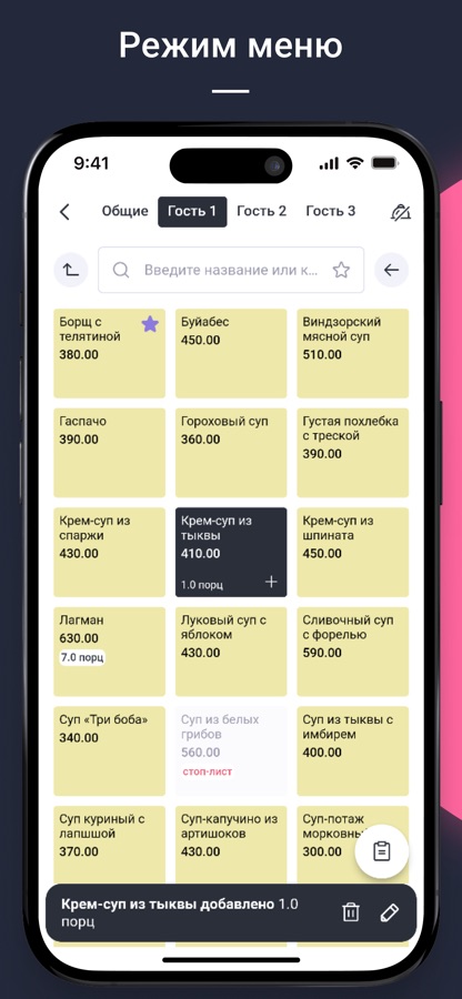 * Создание заказа по гостям упрощает процесс подачи и расчета
