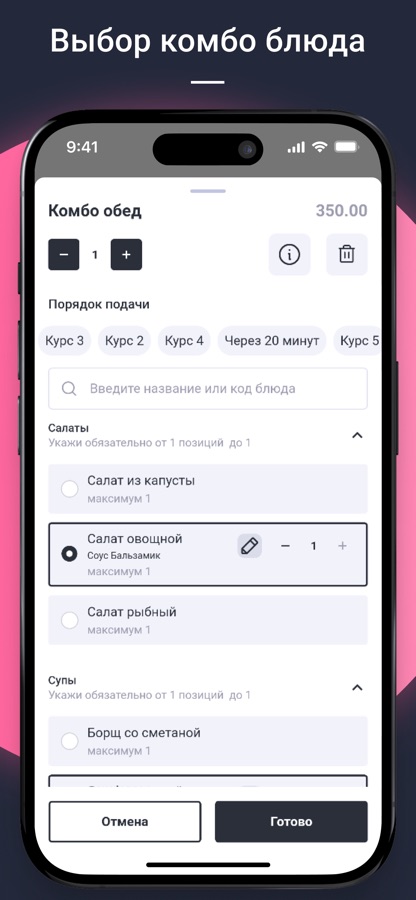 * Использование модификаторов, комментариев, рекомендаций, порядков подачи для блюда помогает учесть все пожелания гостей