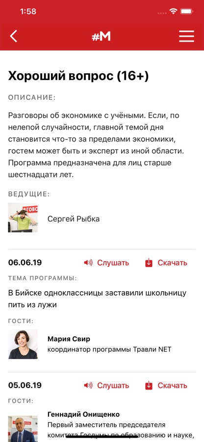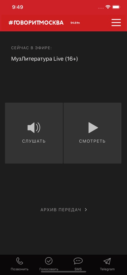 Наше приложение позволяет слушать и смотреть прямой эфир. Вы сможете проголосовать, написать СМС или позвонить в эфир. Также в приложении вы найдете записи программ.