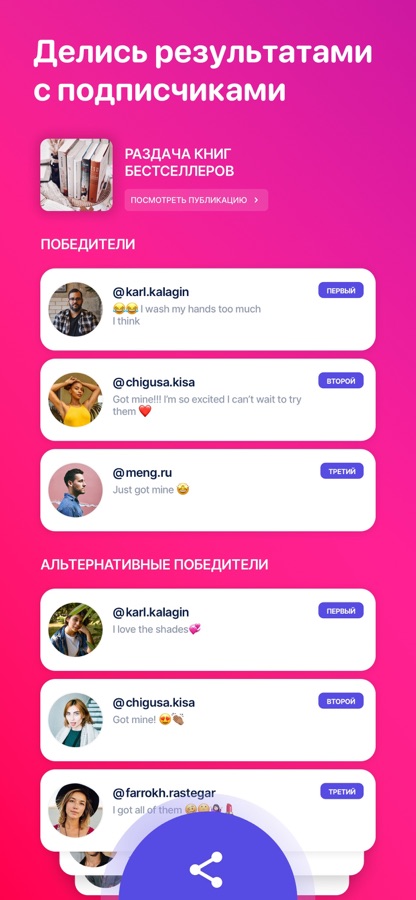 Rafi — самый безопасный сборщик комментариев для розыгрышей в Instagram. Если хочешь выбирать победителей среди тысяч комментаторов в своих постах инстограм, Rafi — отличный выбор. Rafi всегда случайным образом выбирает победителей среди фоловеров, которые прокомментировали твой пост в Instagram. Единственное, что останется сделать — это отправить призы победителям розыгрыша.