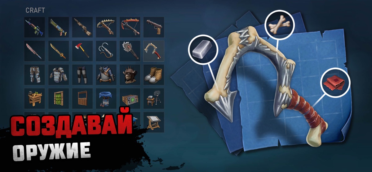 Лови рыбу, готовь еду и собирай питьевую воду. Создавай строительные материалы, одежду, оружие, сундуки и другие необходимые для выживания предметы!