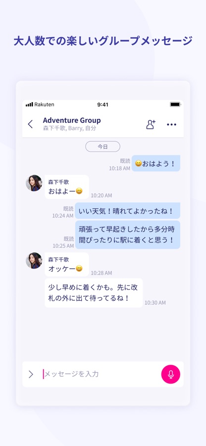 Rakuten Link同士なら最大100人までのグループメッセージが楽しめます。メッセージはもちろん、写真や動画、ファイルも送受信できます。