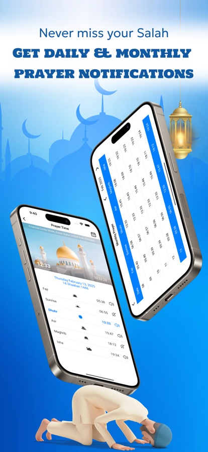 • Просмотр ежемесячного времени молитв по всему исламскому календарю.