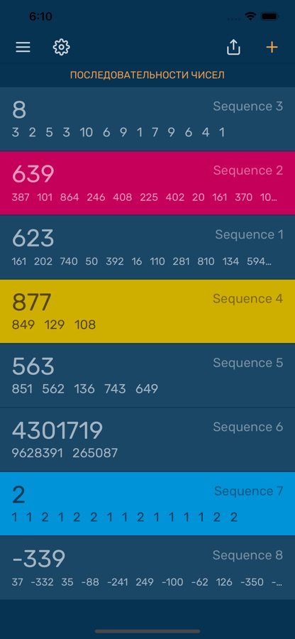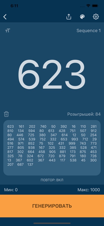 Каждая последовательность случайных чисел имеет панель истории. Вы можете нажать на ее и удалить или поделиться номерами из последовательности.