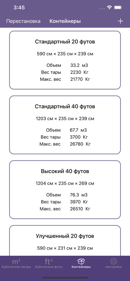 — Создавайте собственные контейнеры с именем, габаритами, объемом и весом