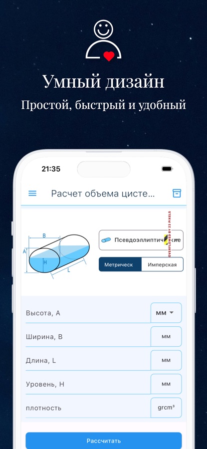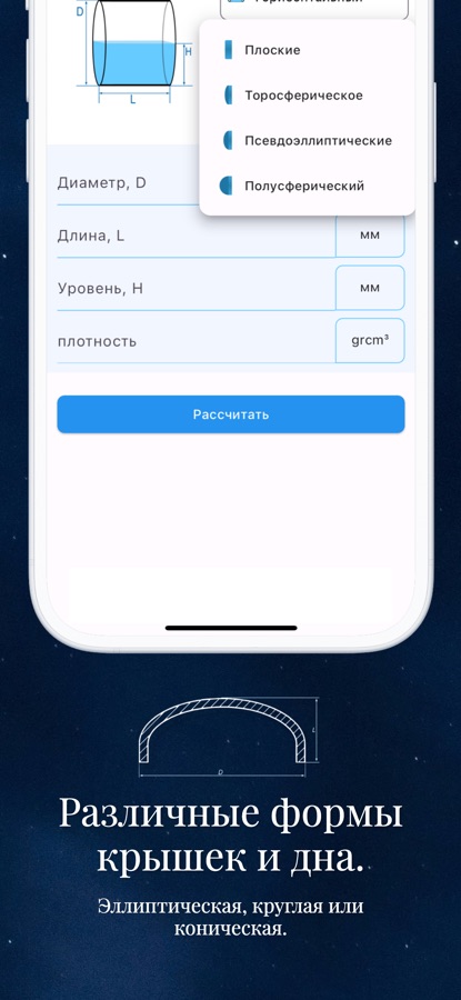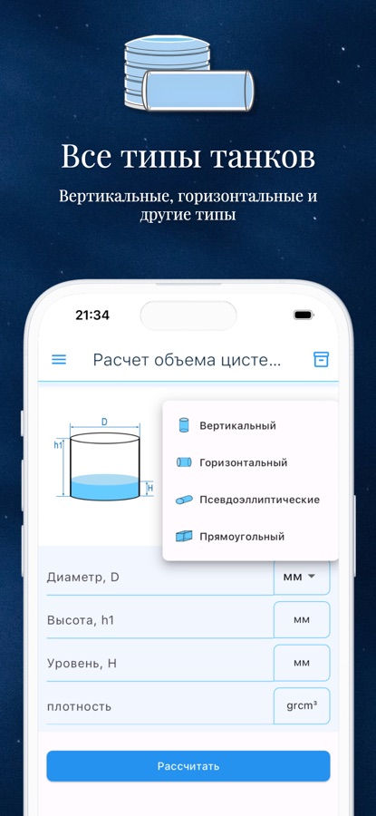 Ключевые особенности: • Рассчитывайте объем различных типов резервуаров: вертикальные, горизонтальные, конические, эллиптические, прямоугольные и аквариумы.