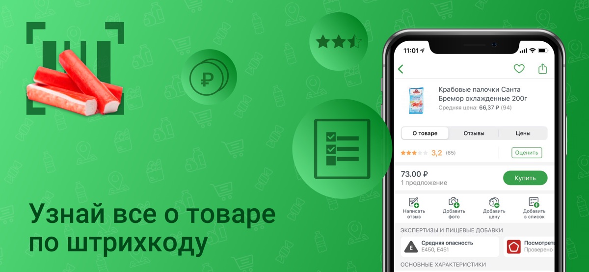 Наведите камеру на штрих код или Data Matrix и приложение покажет отзывы, состав, вредные E-добавки, производителя, среднюю цену в магазинах, оценку и отзывы участников сообщества. Вы увидите, если товар в черном списке Росконтроля, и какая у него оценка Роскачества. Сканируйте штрих код или Data Matrix и выбирайте только лучшие товары для правильного питания по лучшей цене, в нашей базе их более 30 млн. — продукты питания, алкоголь, косметика, бытовая химия и десятки других категорий. Поддерживайте свое правильное питание зная информацию через сканер штрих кодов!