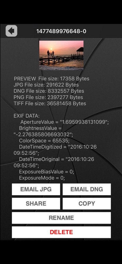 • Full EXIF Data: Complete EXIF data per photo viewable in app and sharable.
