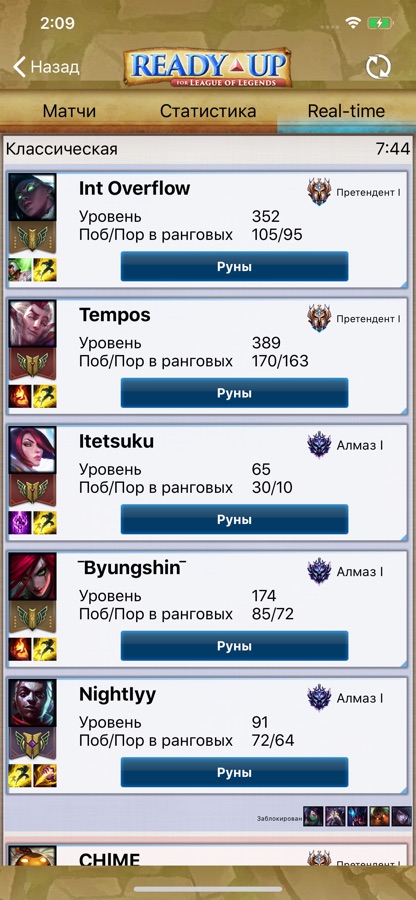 • СТАТИСТИКА, ОБНОВЛЯЕМАЯ В РЕЖИМЕ РЕАЛЬНОГО ВРЕМЕНИ — Найти информацию о союзнике или противнике не составит труда: Дивизион, Расстановки Рун и Талантов. Нужно больше? — Пожалуйста! История игр и статистика игр за конкретных чемпионов, Статистика побед и поражений также доступны для изучения!
