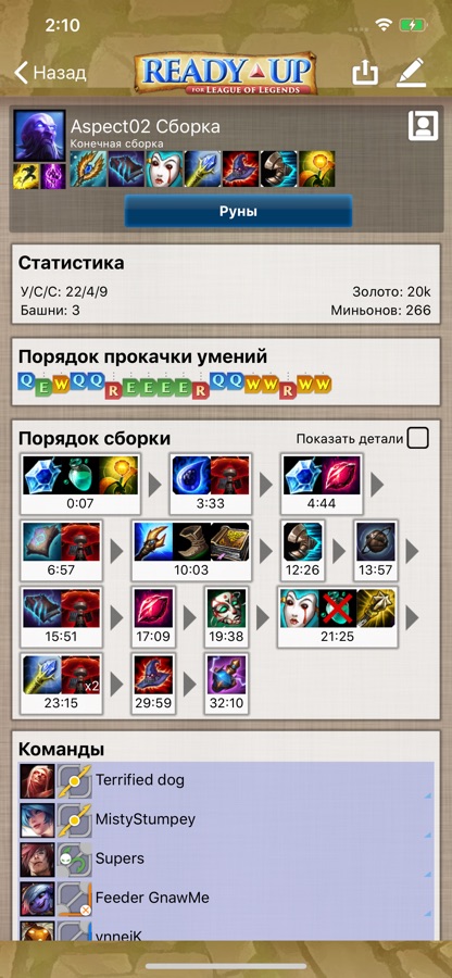 • УГЛУБЛЕННАЯ ИСТОРИЯ ИГР — большинство приложений позволяют просматривать историю игр, но мы пошли дальше! Мы покажем порядок развития умений и предметы, которые помогли игроку достичь успеха в матче. Кроме того, вы можете сохранить лучшие сборки себе в качестве памятки!