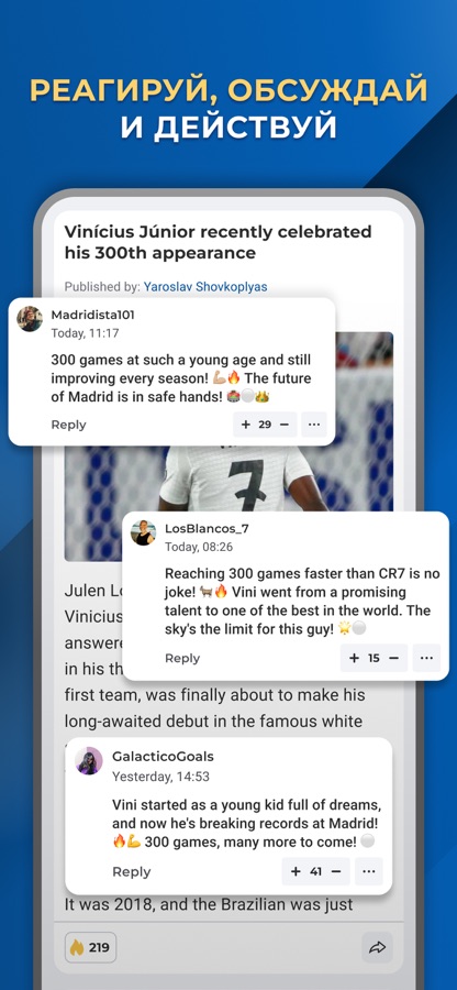 Получай вся важная информация о клубе за секунды: новости, расписание, результаты, аналитические статьи, LIVE-счёт, уведомления о голах, фан-чаты и инструменты для создания собственных постов о Los Merengues — всё для настоящего болельщика.