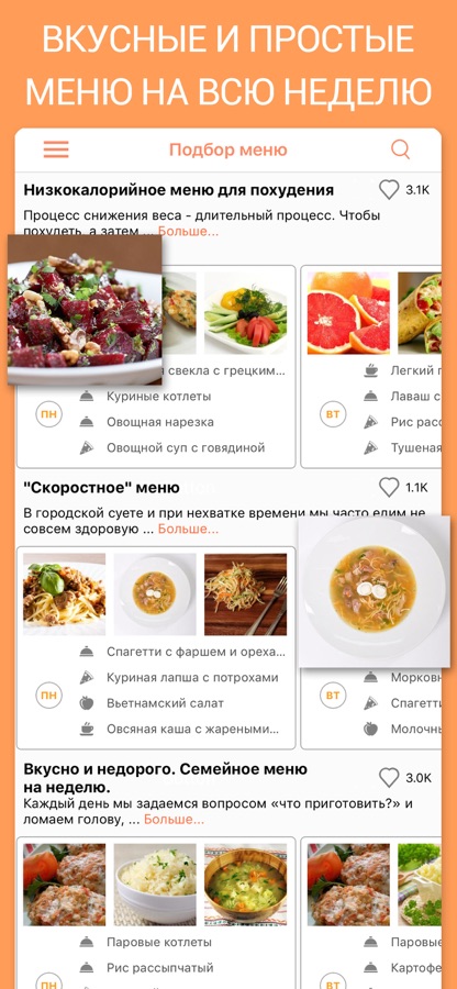 В «Календаре Рецептов» вы можете выбрать уже готовые планы питания на неделю, подготовленные нашими авторами, имеющими значительный опыт в планировании еды, здорового и правильного питания (ПП). В приложении есть меню для похудения (низкоуглеводные и низкокалорийные, а также Минус 60), спортивные, вегетарианские и детские меню. Многие планы питания представлены в нескольких вариантах (на несколько недель).