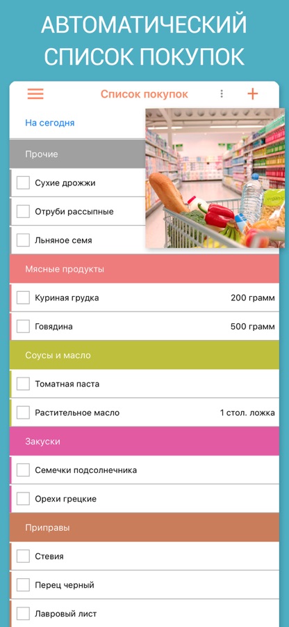 • Планирование меню и покупок, автоматическое составление списка продуктов