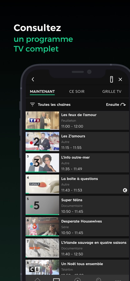 • Suivez et consultez les programmes TV diffusés en direct grâce à un guide complet des 35 chaînes qui font parties de votre abonnement (1)
