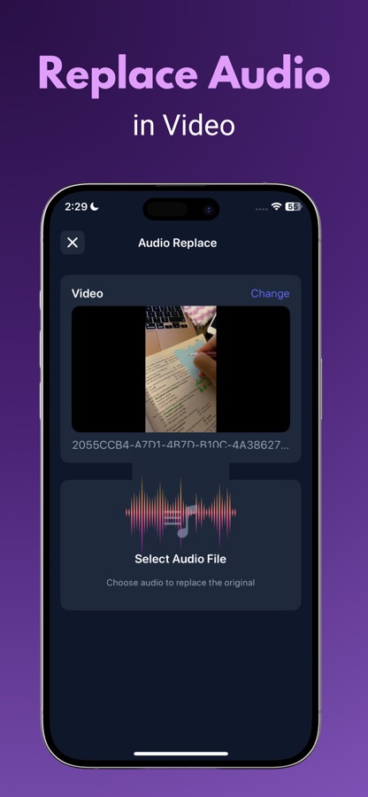 — Replace original audio with custom sound files. Add your own music, voiceover, or audio track to transform your videos.