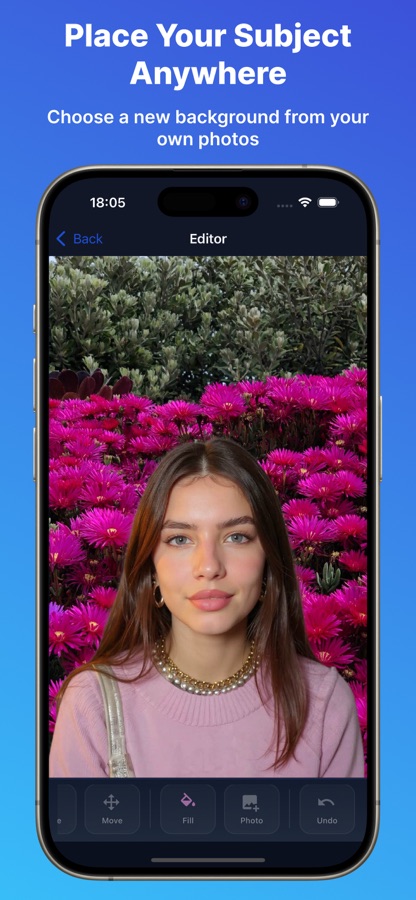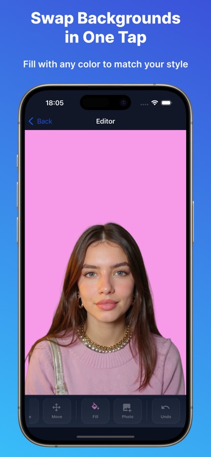 Замените фон на любой сплошной цвет. Идеально подходит для фотографий товаров, портретов и контента для соцсетей.