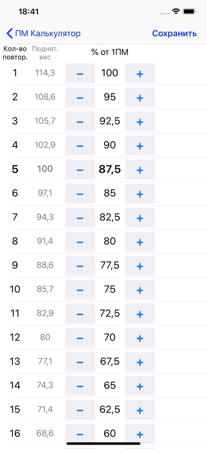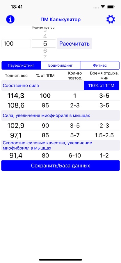 Расчет от 1 до 40 повторений заданным весом для пауэрлифтинга, бодибилдинга и фитнеса