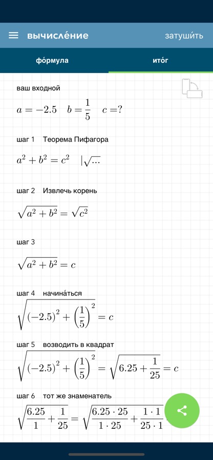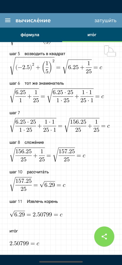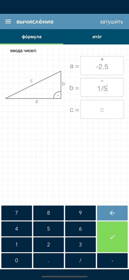 Вычисление прямоугольного треугольника больше не является проблемой. Все ребра вычисляются по теореме Пифагора. Если вы введете значение двух ребер, будет вычислено третье. Все расчеты хранятся в истории. Окончательное решение можно поделиться.