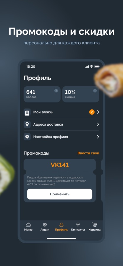 Мобильное приложение позволяет сделать заказ еды домой или в офис, в реальном времени. Доставим ваш заказ до двери как можно быстрее.