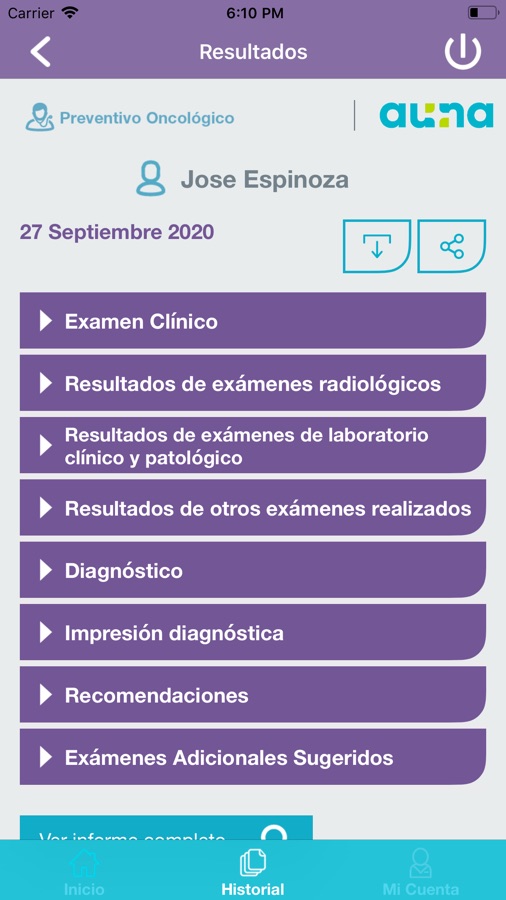 Aplicación que permite a pacientes y médicos de las Clínicas de Auna la visualización de resultados de laboratorio y chequeos preventivos oncológicos.