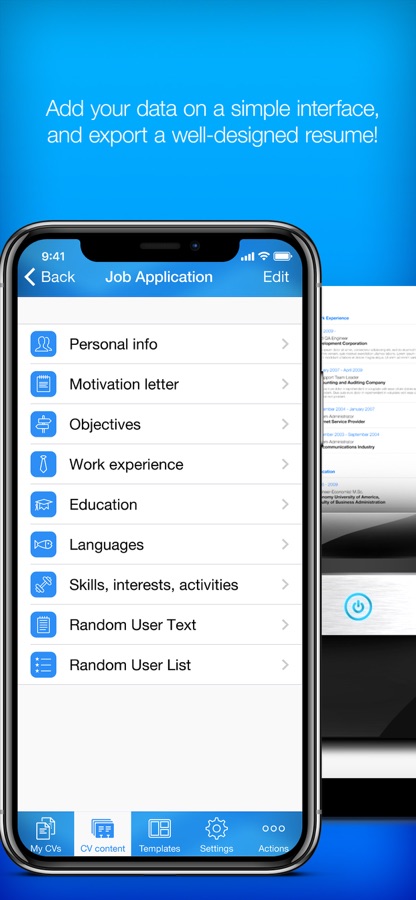 Just simply enter the information and Resume Creator creates the CV for you with the selected template. Then you can email or print your well designed resume with a press of a button, within the app.