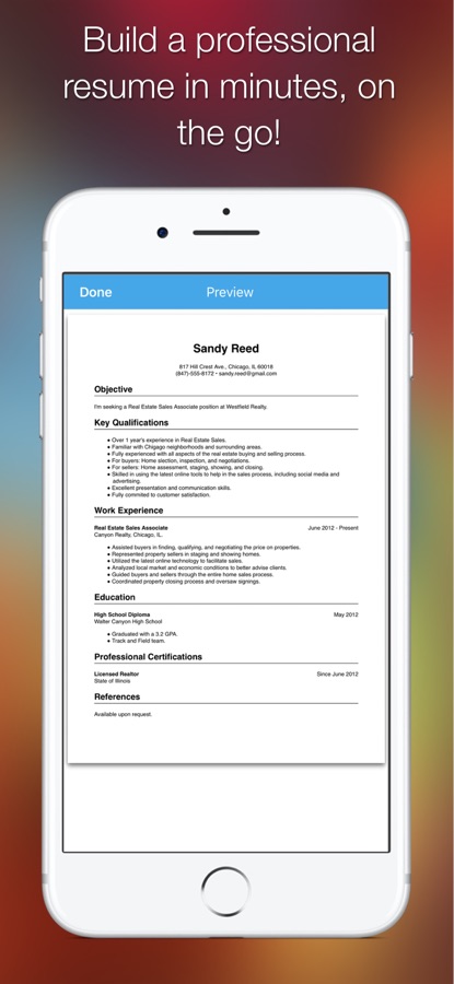 That’s right, this is not a cut-down, limited free edition. It’s the full featured App, and the best one you can buy. There are no gotcha limits on creating and sending resumes. It has everything you need to score that interview.