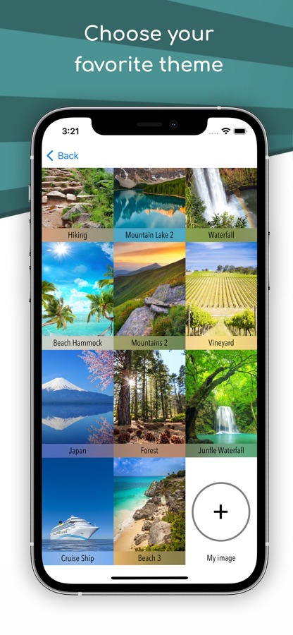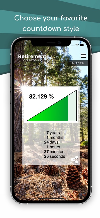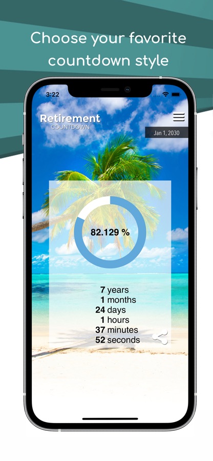 You can customize the look of this app by choosing different themes and background images. Where would you like to retire or go on a long vacation? Do you like the beach? Or hiking in the mountains, skiing in the snow? Or watching beautiful sunsets?