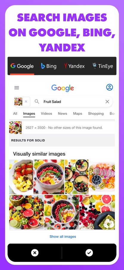 Reverse — Image Search is a FREE smart utility. The app empowers you to search images via Google Image Search, Bing Image Search, Yandex Image Search & TinEye Search engines.