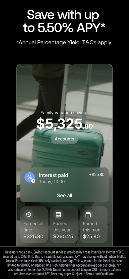*The highest APY is available to users on a Premium or Metal plan. Annual Percentage Yield (APY) is a variable rate and subject to change. These APYs are accurate as of October, 20th, 2023. Monthly fees apply for Premium and Metal plans. Terms and Conditions Apply. No minimum amount required. Savings Vault services provided by Sutton Bank, Member FDIC