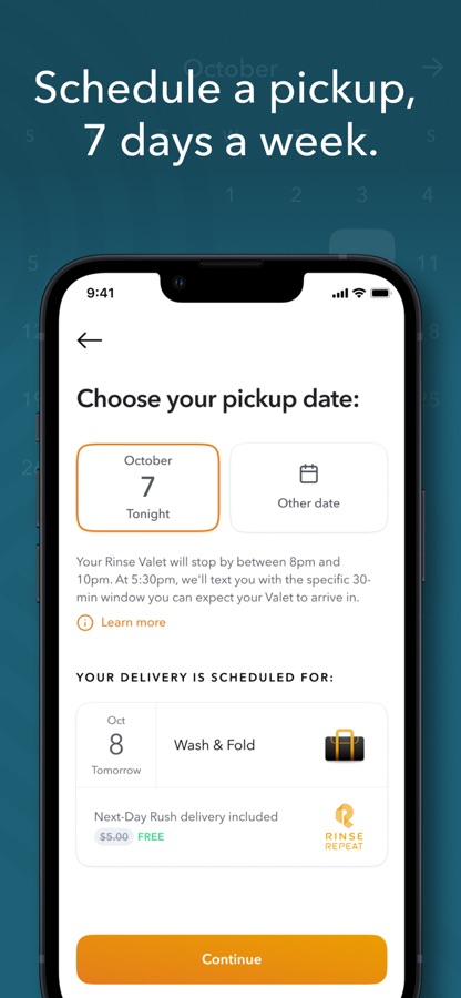 Schedule your pickup for any day of the week. Our service window is 8pm to 10pm, 7 days a week to fit your busy schedule. Use the app to see when your Rinse Valet will arrive.
