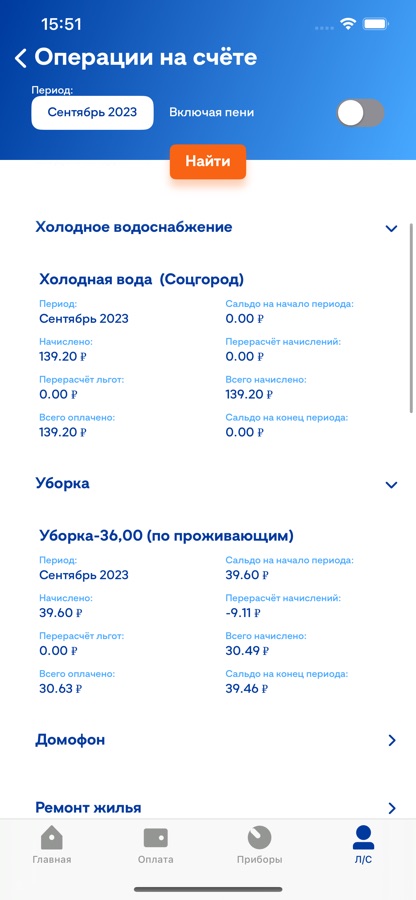 — Посмотреть используемые приборы учёта, ввести их показания, просмотреть историю показаний