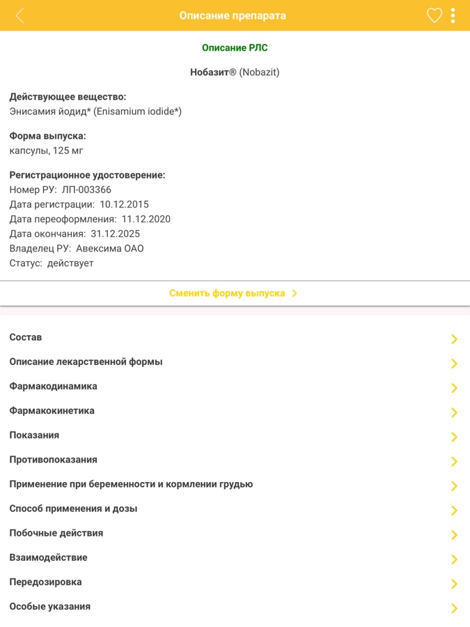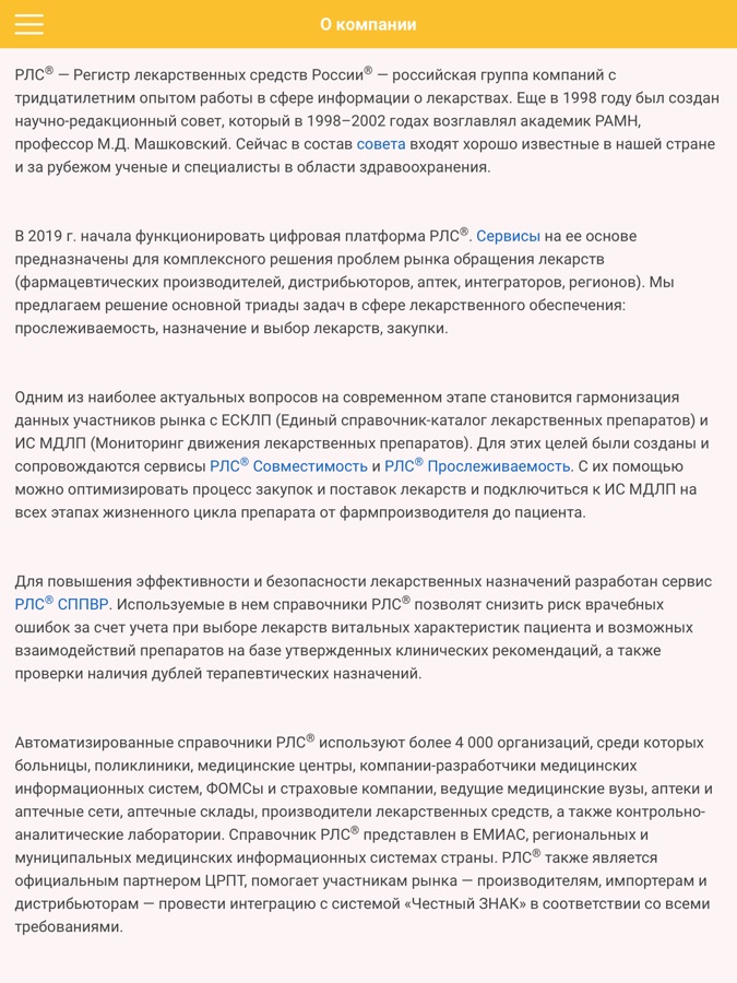 Подробный и компактный медицинский справочник препаратов. Теперь нет необходимости хранить инструкции к медикаментам — они всегда под рукой в смартфоне. Мобильный справочник создан на основе информации из ГРЛС и содержит актуальные инструкции по медицинскому применению и согласованные с производителем или его представителем в России описания лекарственных средств, БАДов, медицинских изделий, зарегистрированных и разрешенных к применению в России.