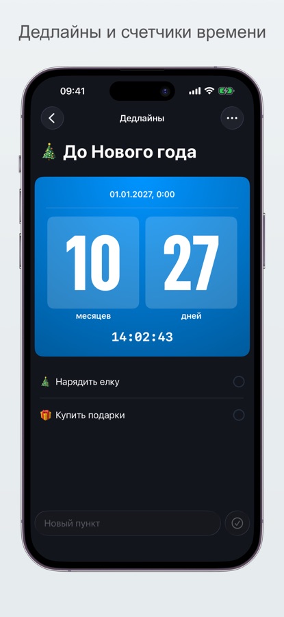 — Использовать разные типы задач: чекбокс, счетчик, таймер, текст, оценка, дедлайн и другие