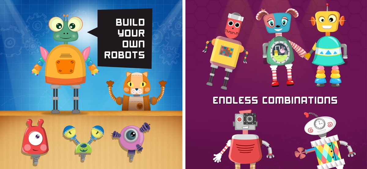Вы можете сделать сердце из вентилятора, голову из электрической лампочки, лицо из радио, голову из консервной банки, волосы из метлы, сердце из часов, ноги из пружин, тела из здания блоки, сердце из собачьей кости животного, тело из мягкой игрушки, голову из шлема, корпус из дартса, рога из животного усиков и т.д. С вашим воображением и более 200 частей (садовые инструменты, ржавые шестерни, игрушки вы играете с, общий дом объектов) для комбинирования, возможности сборки бесконечны. Соедините ноги, тело, руки и голову — и привести механический робот к жизни!