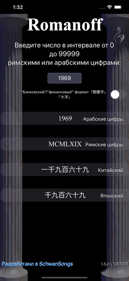 В каком году был римский год «LXIV»? Как вы пишете 333 или 2013 римскими цифрами? Что такое 88237 в японском или китайском с помощью простых символов или формальных «Banking / Financial» символы? Romanoff покажет вам, как вы вводите цифры. SchwanSongs предлагает Вам элегантные римские / Арабский / Восточный числа конвертер, бесплатно!