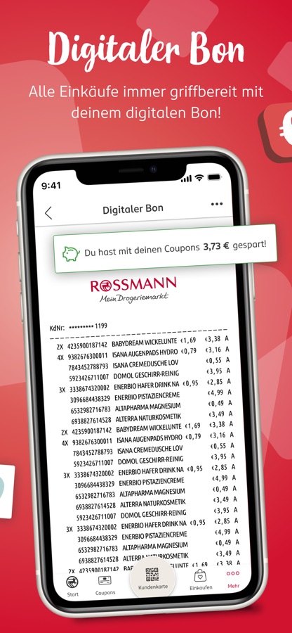 Genieße alle Vorzüge einer Kundenkarte mit der ROSSMANN-App – bei uns aber in digitaler Form. Das heißt einmal Herunterladen und immer Sparen! Zahlreiche Coupons und die aktuellen Angebote stehen dir in der App jederzeit zur Verfügung.