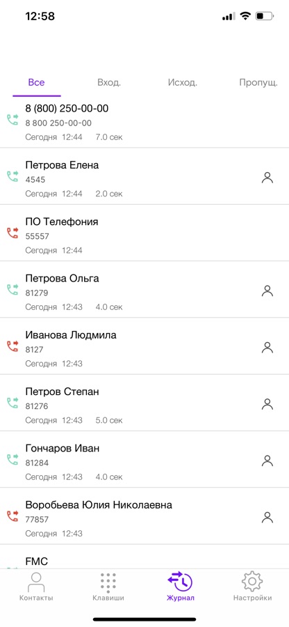 — Входящие и исходящие вызовы на городские, мобильные и короткие номера внутри компании