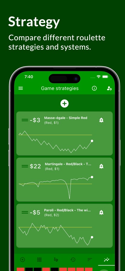 Roulette Strategies and Systems: Explore a curated selection of established roulette strategies and systems within the app, including Masse-égale, Martingale, Fibonacci, and more. Please note that these strategies do not guarantee long-term profit and are provided for informational purposes only.