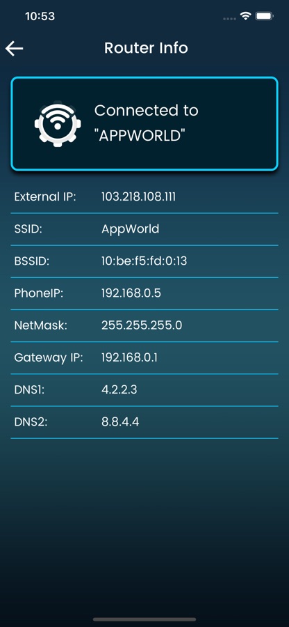 WIFI Info : IP Address, Physical Address, WiFi Frequency, MAC Address, External IP Address, DNS Server, DNS Address, Gateway (192.168.0.1) and many more info.