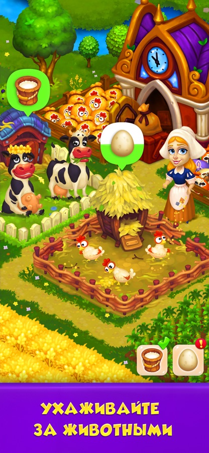 В игре вас ждут очаровательные домашние животные – коровы, куры, овцы; огороды и фруктовые сады с разными растениями, овощами и ягодами, а также красивые сельскохозяйственные здания и фабрики.