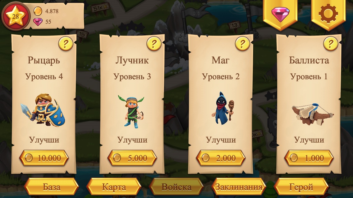• Улучшайте героя, рыцарей и заклинания