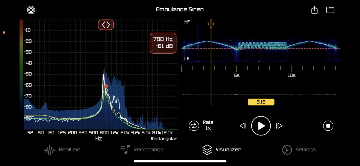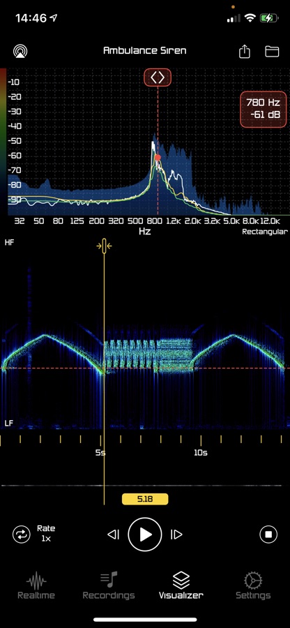 This module presents you the results of offline audio analysis. Selecting previously captured recording gives the graph view, spectrogram and waveform of the audio data. Simple controls gives you the ability to play, loop, seek and change rate of the recording synchronized with analysis data presentation. Export function allows you to share or archive your analysis. Resulting PDF document contains basic recording information, spectrogram, peak & RMS graph and frequency table data with maximum peaks (with the time of the occurrence in recording)