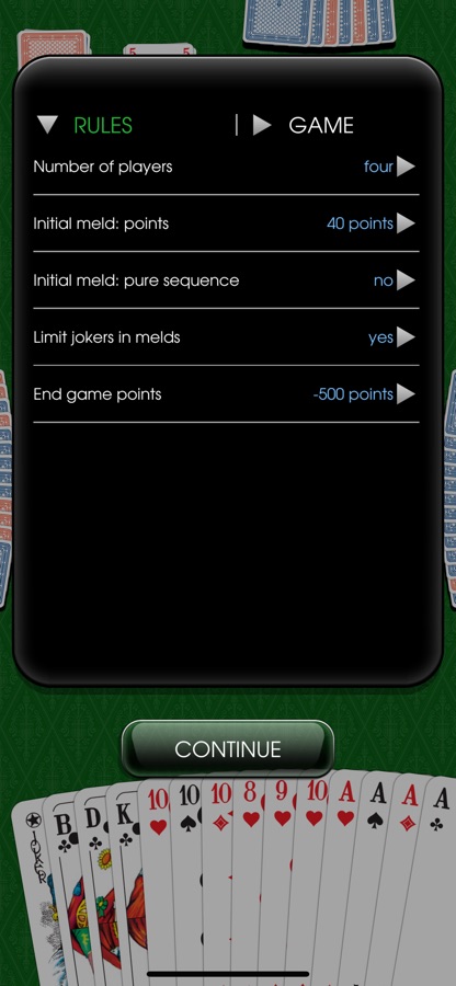 Rummy features an excellent design and an intuitive interface. The most common rules are set by default but can be customized with numerous options.