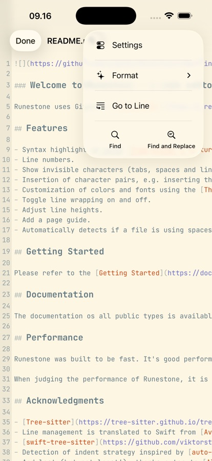 Runestone is made by a single person with a love for text editors and a vision of building the most lightweight text editor for iPhone and iPad that still has the core features for editing code.