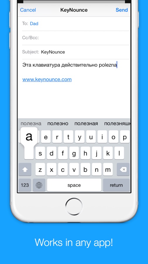 KeyNounce works in any app! Once you enable the keyboard you’ll be able to easily compose texts, emails, tweets, facebook posts, and search the web in Russian.