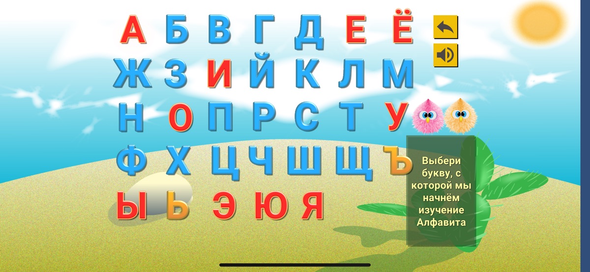 Первая — Алфавит, где всё доступно с самого начала, вы можете повторять любую буковку и звук в любое время. При первом просмотре включается автоматический режим (после активации любого элемента);