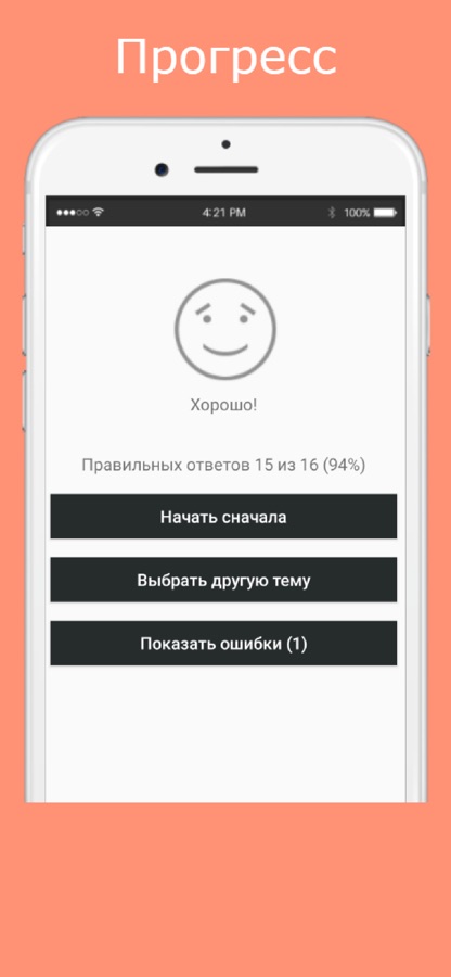 После прохождения теста по выбранной теме, можно просматривать ошибки. Также, результат прохождения теста по каждой из тем сохраняется, ваша цель — выучить все слова в выбранной теме на 100%.