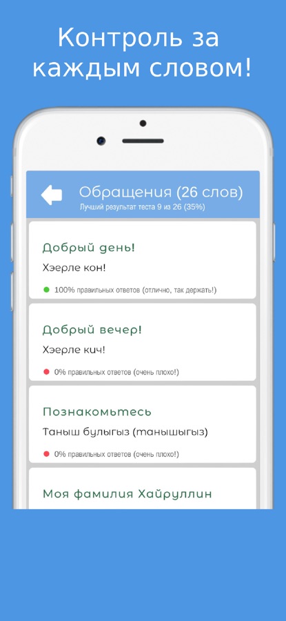 После прохождения теста по выбранной теме, можно просматривать ошибки. Также, результат прохождения теста по каждой из тем сохраняется, ваша цель — выучить все слова в выбранной теме на 100%.