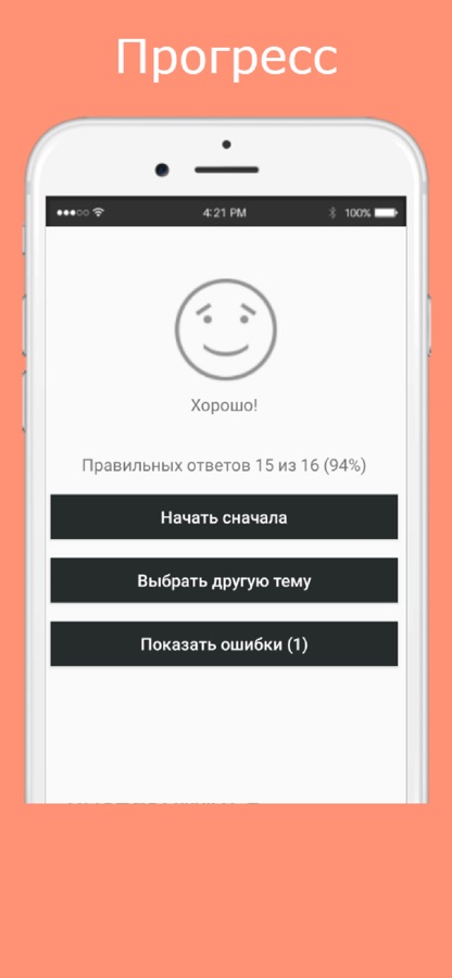 После прохождения теста по выбранной теме, можно просматривать ошибки. Также, результат прохождения теста по каждой из тем сохраняется, ваша цель — выучить все слова в выбранной теме на 100%.