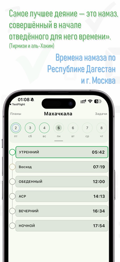 В приложении приведена время намазов для следующих городов и раионов: Махачкала, Бабаюрт Буинакск Даг Огни Дербент Избербаш Каспииск Кизилюрт Кизляр Хасавюрт Южно Сухокумск Ахвахский Ахтынский Ботлихский Гергебильский Гумбетовский Казбековский Левашинский Тляратинский Унцукульский Хунзахский Цумадинский Чародинский Шамильский и другие населенные пункты Дагестана